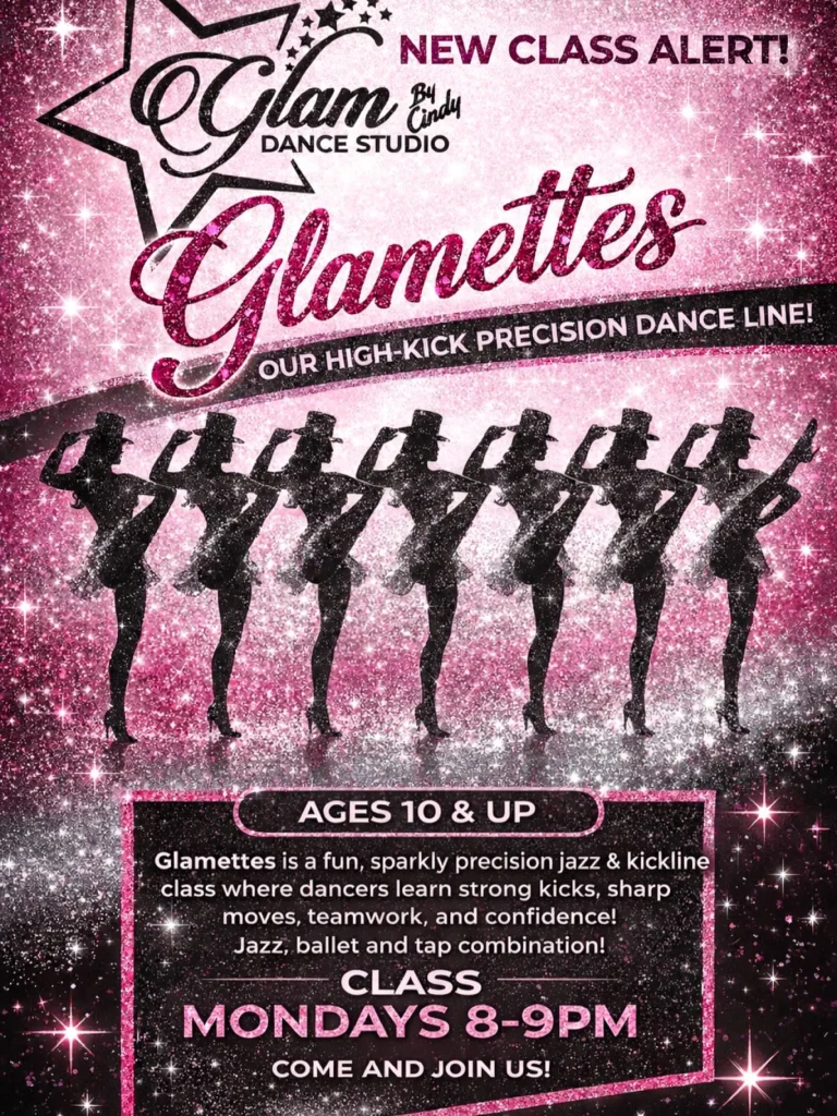 Where precision meets sparkle 💎💫High-kick jazz, teamwork, confidence & glam energy!✨Mondays 8–9 PM | Ages 10+💖 Kick high. Shine bright. Dance glam.